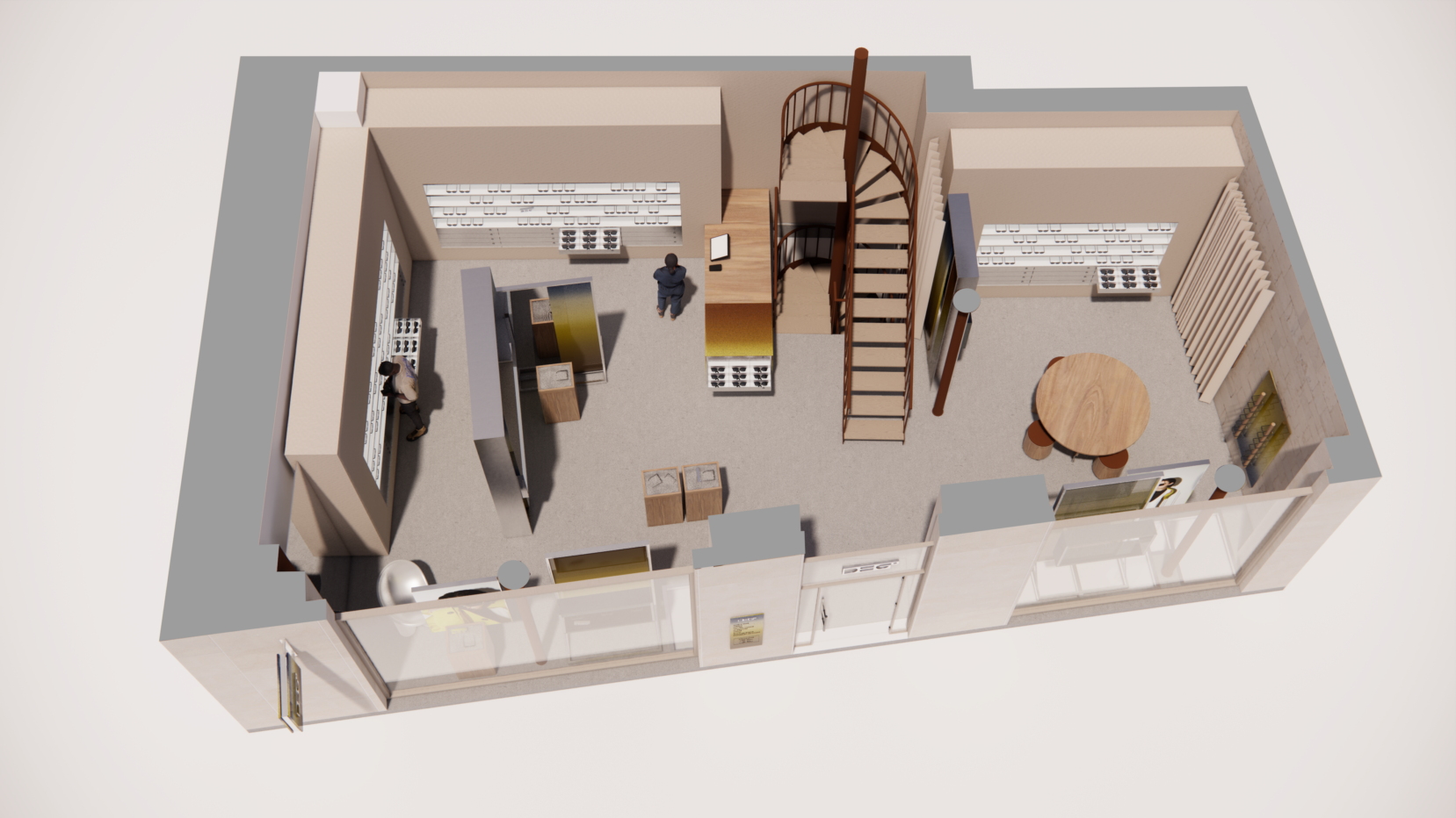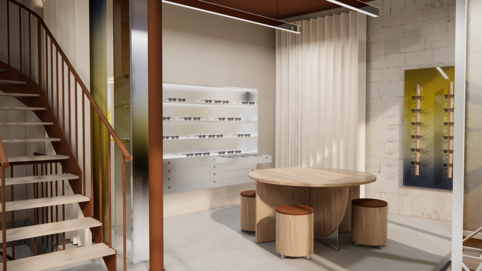 The right side of the store is made to appear more like a showroom. Here a free-standing round table has the possibility to serve both as a product display, but also as a gathering point for employees, customers and clients. On the back wall, as in the retail section, glasses are displayed and below them built-in drawers function as storages.