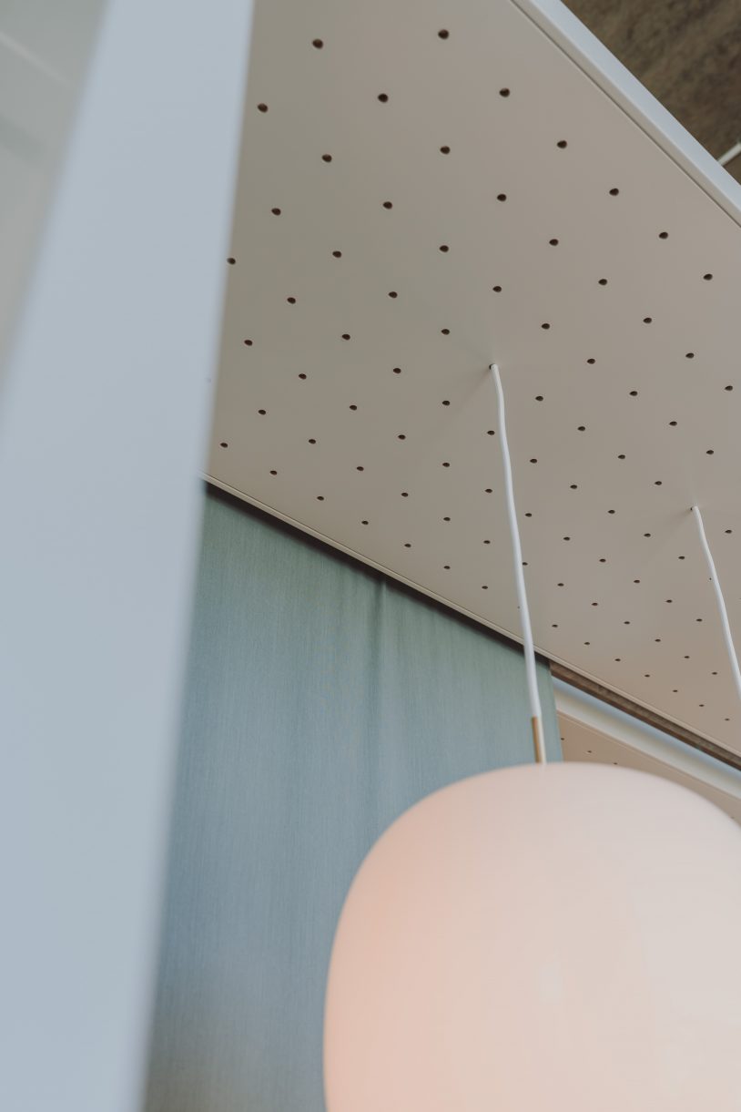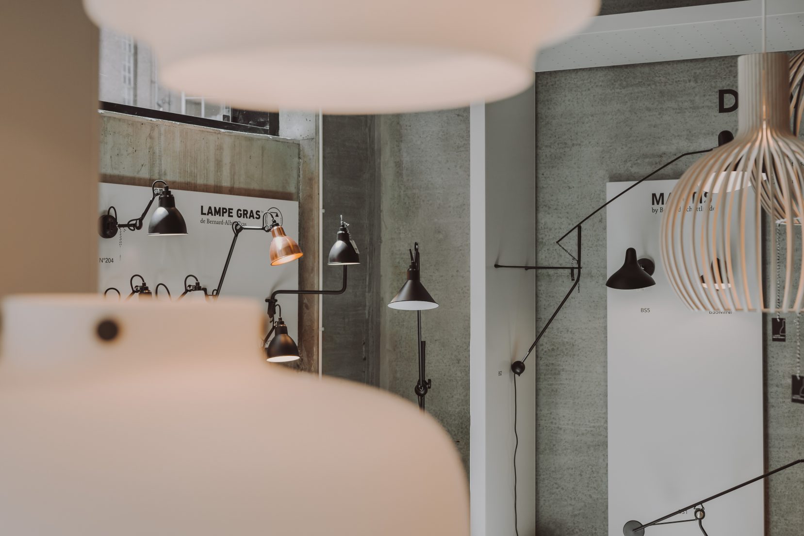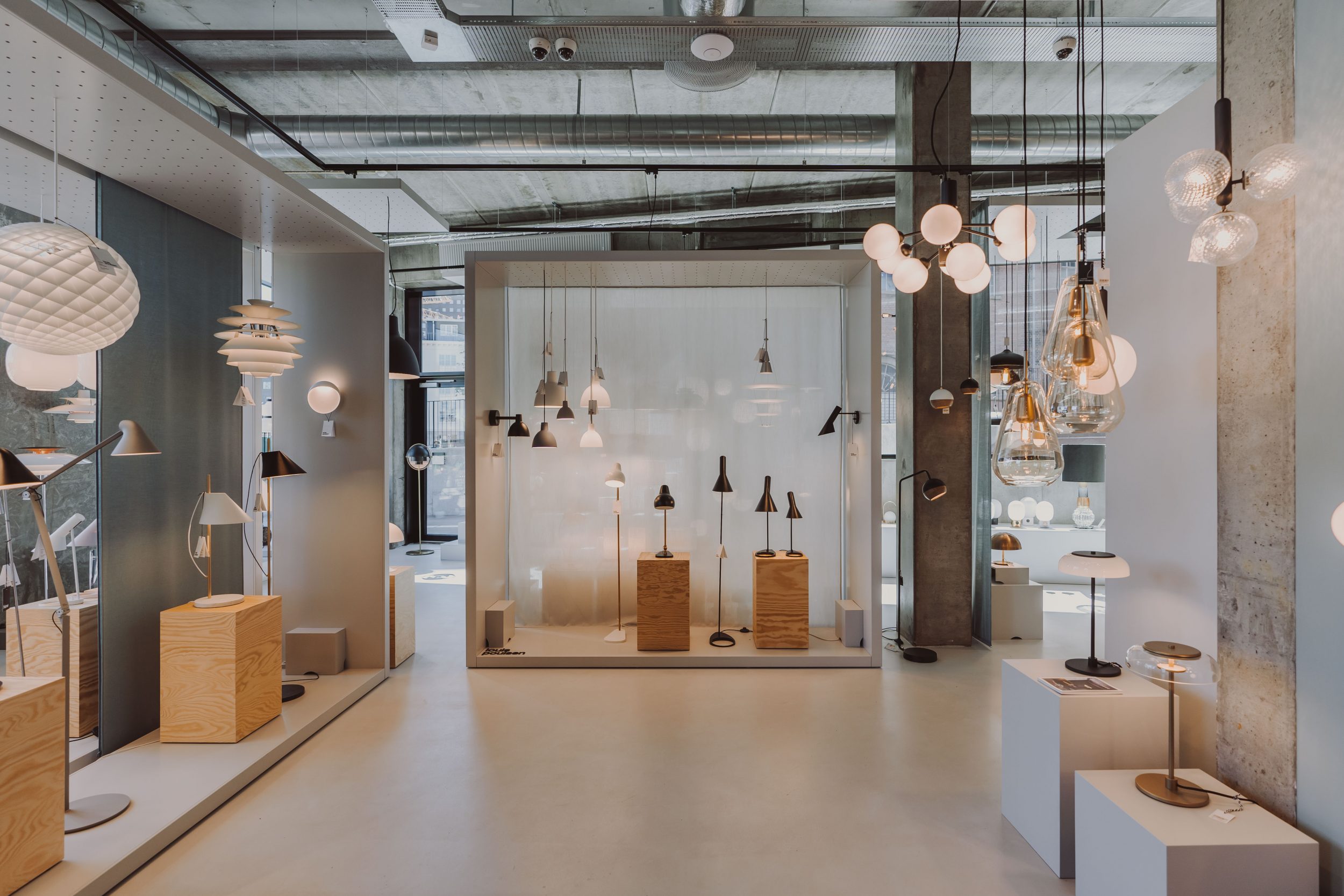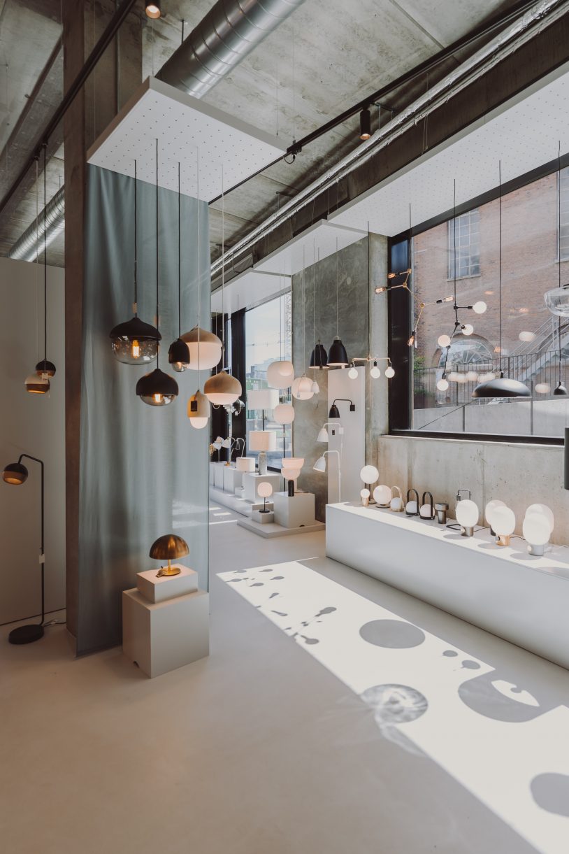 The retailer has a large catalogue of products to display, so the store features a space plan that creates different zones for the various lamp series. The shop is designed with light grey fixtures and curtain backdrops to display the lamps in a calm setting, so each series can stand out on its own.