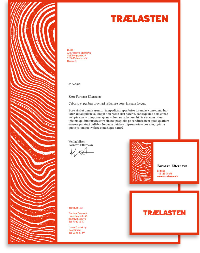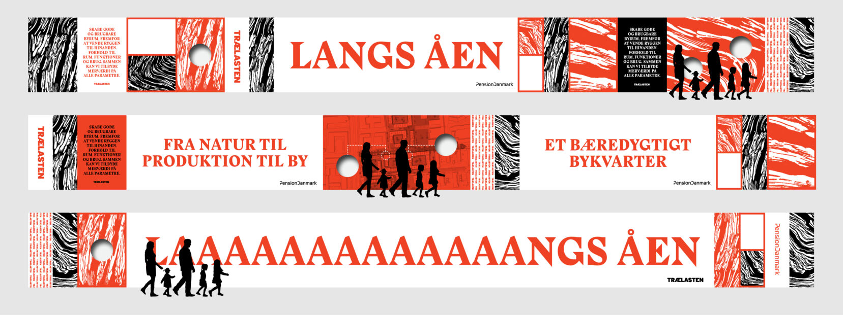 To add a distinct and unique element to the visual identity BRIQ developed a fifth element. These graphic elements are abstract representations of wood veins and running water. The fifth element can be used in multiple ways to create distinct graphic compositions and to make Trælasten stand out as a new urban district marking its unique identity as a part of Aarhus city.